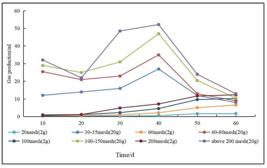 - Specific surface area and particle size. The specific surface area and particle size affect biomethane production to some extent (Figure 7). A smaller coal particle size and an larger specific surface area enable microorganisms to be in full contact with the coal surface, which contributes to higher biomethane production [98]. Guo et al. [110] conducted gas production experiments using subbituminous coal and found that gas production increased as the coal particle size decreased. In gas production experiments using lignite of different particle sizes, Wang et al. [111] found that the smaller the particle size, the easier it was to produce methane; however, when the particle size was less than 0.15 mm, the effect of particle size on gas production was no longer obvious.