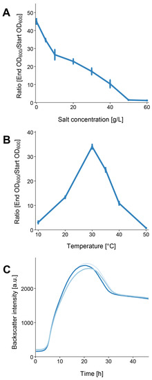 L. flocculans sp. nov. growth characteristics. (A) Growth of EIF3T in 4 mL LB medium after 12 h of incubation at 180 rpm and 30 °C with different salt concentrations. (B) EIF3T growth at various temperatures in LB-0 medium after 12 h of incubation at 180 rpm. (C) Growth characterization of EIF3T in 25 mL LB-0 medium at the optimal temperature (30 °C). Triplicate measurements were conducted. Standard deviations in (A,B) are indicated by the error bars. In (C) various shades of blue represent each biological replicate.