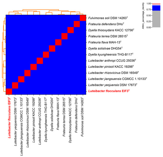 GTDB-Tk was used for the genome-based taxonomic classification of strain EIF3T (Data File S1) [25]. It demonstrated an average nucleotide identity (ANI) of approximately 96% to the most closely related species, Luteibacter sp. UNCMF366Tsu5.1 (ANI value of 96.48). The digital DNA-DNA hybridization value (dDDH) calculated by the Type Strain Genome Server (TYGS) is 39.9% in comparison to L. jiangsuensis. As the new species criterion for dDDH is less than 70% [46], this suggested that our strain is a potential new species (Figure S2; Table S4). Figure 3 shows an ANI-analysis of 12 most closely related type strain genome sequences in the TYGS database [26] (data in Table S5). No clustering with any other described Luteibacter strain was recorded. EIF3T shares 85.52% ANI with L. yeojuensis DSM 17673T, 85.41% with L. jiangsuensis CGMCC 1.10133T, 84.73% with L. anthropic CCUG 25036T and 84.60% with L. rhizovicinus DSM 16549T.