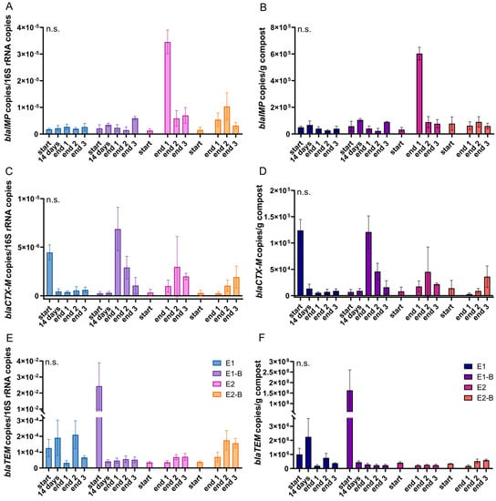 Copy numbers of beta-lactam ARGs blaIMP (A,B) and blaCTX-M (C,D), as well as blaTEM (E,F) as assessed by qPCR. Copy numbers were normalized to 16S rRNA gene copy numbers (left charts) and to 1 g compost (right charts). Bars represent the average of three individual qPCR measurements with standard deviation. Start samples, 14-days samples (only repetition 1) and end samples are depicted individually for the first (E1, E1-B) and second repetition of composting (E2, E2-B). End samples comprise replicates from front (end 1), middle (end 2) and back (end 3) of each compost pile. The p-values were calculated to compare start with end samples of composting for all four compost piles combined (average of the triplicate end samples, no differentiation of the treatments). None of the sample sets showed significance (p < 0.05). Therefore, they are indicated by “n.s.” (not significant).