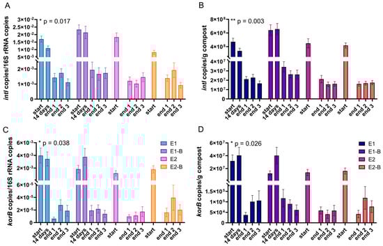 Copy numbers of the class 1 integron-integrase gene intI1 (A,B) and IncP-1 marker gene korB (C,D) as assessed by qPCR. Copy numbers were normalized to 16S rRNA gene copy numbers (left charts) and to 1 g compost (right charts). Bars represent the average of three individual qPCR measurements with the standard deviation. Start samples, 14-days samples (only repetition 1) and end samples are depicted individually for the first (E1, E1-B) and second repetition of composting (E2, E2-B). End samples comprise replicates from the front (end 1), middle (end 2) and back (end 3) of each compost pile. Asterisks indicate the p-values obtained from Student’s t-test (* p < 0.05, ** p < 0.01) representing the statistical significance of the data. The p-values were calculated to compare start with end samples of composting for all four compost piles combined (average of the triplicate end samples, no differentiation of the treatments).