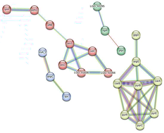 Twenty-two of fifty-three differentially abundant proteins were connected in a STRING network indicating functional and physical protein interactions (Figure 1, Tables S5–S8). Cluster analysis revealed 4 independent clusters. The cluster 1 (red) was represented by proteins involved in pyruvate metabolism plus LplA highly associated with lipoate-dependent PdhD. The cluster 2 (white) included highly associated proteins of nucleotide and amino acid metabolism (F/E) plus glycogen biosynthesis protein GlgD (G). DUF4430 domain-containing protein (LGG_02295) of unknown function is encoded by a gene in neighborhood with an rtpR gene, whereas RtpR and PfpI are encoded by fused genes in the cluster 3 (green). Components of a thiol-specific antioxidant system are connected into the cluster 4 (blue).