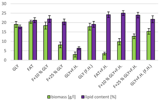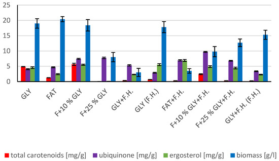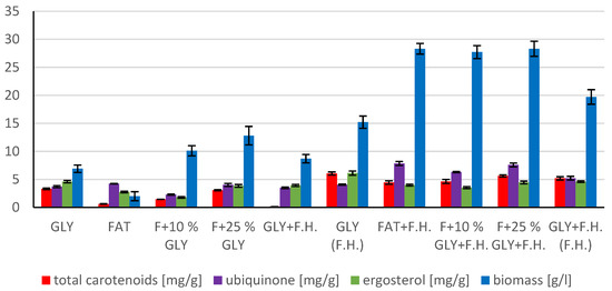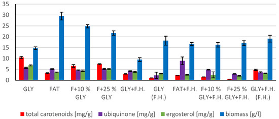 The most significant biomass productions were achieved in FAT + F.H. (28.3 g/L) and F + 25% GLY + F.H. (28.3 g/L) media. Significant carotenoid productions were observed in cultures in F + 25% GLY + F.H. (5.612 mg/g) and GLY (F.H.) (6.044 mg/g) media. The highest concentrations of ergosterol were achieved in GLY (F.H.) (6.118 mg/g) and GLY + F.H. (F.H.) (4.621 mg/g) media. Ubiquinone was produced in the highest concentrations in F + 25% GLY + F.H. (7.573 mg/g) and FAT + F.H. (7.838 mg/g) media. The percentage of lipid content (38.33%) and SFA production (5.76 g/L) was observed in the culture in the F + 10% GLY + F.H. medium. The highest production of MUFA (3.43 g/L) and PUFA (2.43 g/L) was observed in the FAT + F.H. medium. Results of cultivations are presented in Figure 13, Figure 14 and Figure 15.