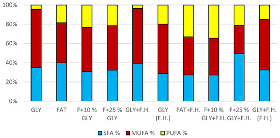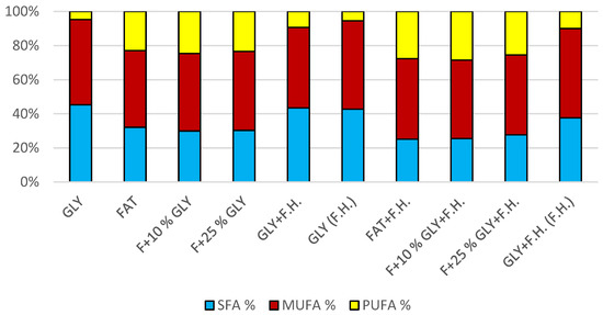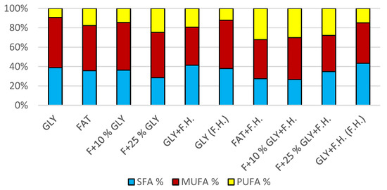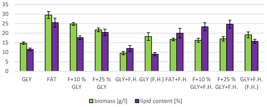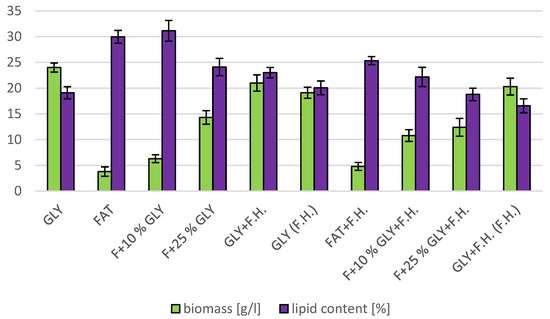 The most significant biomass growths were achieved in F + 25% GLY (15.9 g/L) and FAT + F.H. (16.1 g/L) media. The notable carotenoid productions were observed after cultivation in F + 10% GLY (1.845 mg/g) and GLY (2.690 mg/g) media. The concentrations of ergosterol in the biomass reached the highest values in GLY (F.H.) (8.231 mg/g) and GLY (9.247 mg/g) media. Ubiquinone was produced by biomass in the greatest values in FAT + F.H. (14.712 mg/g) and F + 10% GLY + F.H. (15.251 mg/g) media. In the second series of media with mixed carbonaceous substrates, a trend of decreasing lipid accumulation can be observed according to the decreasing fat content in the media. The highest accumulation of lipids (32.30%) and the production of SFA (2.48 g/L) and MUFA (1.85 g/L) were observed in cultivation in FAT + F.H. The highest production of PUFA (0.92 g/L) was observed in the F + 25% GLY + F.H. medium (Table S5, Supplementary).