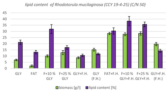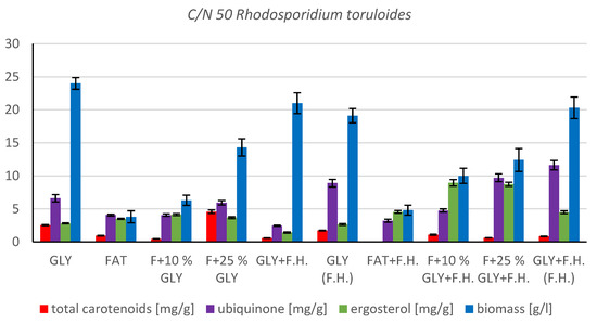 During cultivations at C/N 50, significant increases in biomass were observed in the yeast strain Sporidiobolus pararoseus in the F + 10% GLY + F.H. (30.1 g/L) medium and Rhodotorula mucilaginosa (CCY 19-4-25) in FAT + F.H. and F + 25% GLY + F.H. media (28.3 g/L). On the same strain, significant carotenoid production was also found in the GLY (F.H.) medium (6.044 mg/g) and F + 25% GLY + F.H. medium (5.613 mg/g). The most significant ergosterol productions were recorded in strains of Sporidiobolus pararoseus on the GLY (F.H.) medium (14.365 mg/g) and Rhodotorula kratochvilovae in the F + 10% GLY + F.H. medium (11,584 mg/g). In the Rhodotorula kratochvilovae strain, the most significant production of ubiquinone was observed in GLY + F.H. (F.H.) (15.505 mg/g) and GLY (F.H.) (13.149 mg/g) media. A significant accumulation of lipids and the percentage content of lipids in the biomass at the same time were observed in the strain Rhodotorula mucilaginosa (CCY 19-4-25) in the F + 10% GLY + F.H. medium (38.33% with a lipid production of 10.62 g/L). Another important producer of lipids was the strain Rhodotorula kratochvilovae on the F + 25% GLY + F.H. medium (with lipid accumulation 37.87%). The second most significant value of lipid production was recorded for the strain Sporidiobolus pararoseus in the F + 10% GLY + F.H. (10.32 g/L) medium.