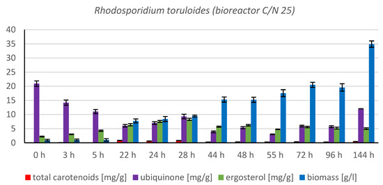 The data show that the significant producer of biomass at C/N 25 is the yeast Rhodotorula mucilaginosa (CCY 19-4-25), which showed the highest biomass growths in the FAT (29.5 g/L) and F + 10% GLY medium (24.8 g/L). At the same time the highest accumulations of carotenoids were recorded in GLY (10,469 mg/g) and F + 25% GLY (7.430 mg/g) media. The most significant accumulations of ergosterol were recorded in Cystofilobasidium macerans strains in the FAT + F.H. medium (9.932 mg/g) and Sporidiobolus pararoseus in the GLY medium (9.247 mg/g). The Sporidiobolus pararoseus strain showed the highest ubiquinone accumulation in F + 10% GLY + F.H. (15.251 mg/g) and FAT + F.H. (14.712 mg/g) media. The most accumulated lipids were recorded in the yeast culture Rhodotorula mucilaginosa (CCY 20-9-7) in the FAT medium (46.79%) and Rhodotorula kratochvilovae in the FAT + F.H. medium (40.82% with lipid production of 5.75 g/L). The highest lipid production was recorded in the yeast Rhodotorula mucilaginosa (CCY 19-4-25) in the FAT medium (7.52 g/L)