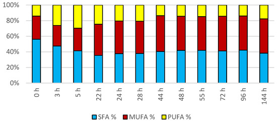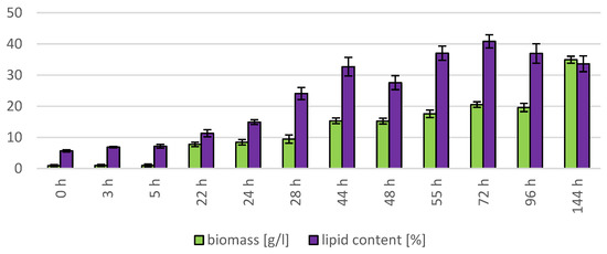 The cultivation in a laboratory bioreactor showed that under controlled conditions, a significant growth in biomass can be achieved, as can be observed in Figure 7 in the 144th hour of cultivation (34.92 g/L). The production of carotenoids did not report significant increments; its maximum was reached at the 22nd hour of cultivation (0.831 mg/g). The concentration of ergosterol in the biomass reached its maximum at the 28th hour of cultivation (8.280 mg/g). The highest observed production of ubiquinone was at the beginning of cultivation (20.942 mg/g), but significant production was also achieved in the culture at the 144th hour of cultivation (12.059 mg/g). The highest percentage content of lipids in the biomass was observed at the 72nd hour of cultivation (40.81%), but the most significant production of all types of fatty acids was achieved at the 144th hour of cultivation (SFA 4.50 g/L, MUFA 5.15 g/L, PUFA 2.08 g/L). Results of cultivation are presented in Figure 7, Figure 8 and Figure 9.
