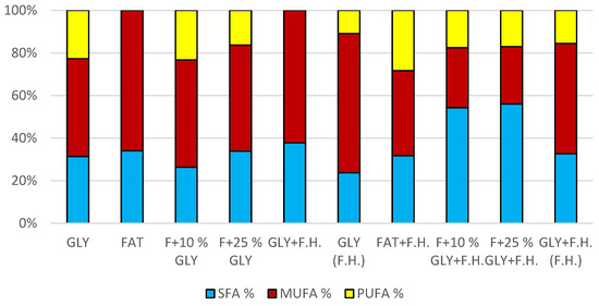 The highest biomass production in the first series was recorded in mixed carbon substrate media, F + 10% GLY (17.7 g/L) and F + 25% GLY (19.2 g/L). Significant productions of carotenoids and ergosterol were achieved in the control media of the first series; in the GLY medium, the production of carotenoids reached 1.602 mg/g and ergosterol reached 3.443 mg/g of biomass, while in GLY + F.H., the production of carotenoids was 1.439 mg/g and ergosterol achieved a biomass of 3.778 mg/g. The highest ubiquinone productions were observed in the GLY medium (10.495 mg/g) and in the F + 25% GLY + F.H. medium (6.238 mg/g). A significant lipid production was recorded in the FAT + F.H. medium (40.82% of dry biomass), which generally showed the highest production of all types of fatty acids (SFA 2.26 g/L, MUFA 2.18 g/L and PUFA 1.31 g/L medium). There is also an observable trend in the second series of samples with F.H., in which with the increasing concentrations of fat in the media, the percentage accumulation of lipids in the biomass also increases (Table S3, Supplementary).