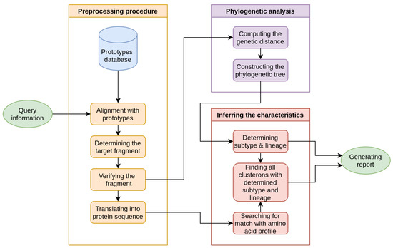The computational pipeline is comprised of three procedures: preprocessing, phylogenetic analysis, and inferring the characteristics. The preprocessing procedure extracts a specific E protein coding sequence fragment containing sufficient genetic information for query characterization. The fragment has a restricted length of 454 bp (from nt 309 to 762 according to the sequence of the Vasilchenko strain, GenBank: M97369). Thus, fragments with insertions, deletions, or ambiguous nucleotide characters are excluded from analysis. The second pipeline step consists of constructing a phylogenetic tree for coding sequences (called prototypes). We evaluated several tree construction algorithms and showed that this process requires knowledge about the tree on the coarse scale (i.e., clade or branch). Inferring the subtype and lineage depends on the position of the query taxon and its sister node’s clade. The specifics of the algorithm have been described elsewhere [23].