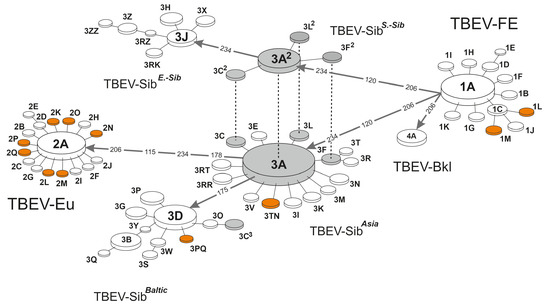 The “Clusteron Structure” section provides an overall picture of TBEV evolution. Such a visualization provides the opportunity to study the history of evolution at both the global and local scales. The CS assigns a unique identifier, referred to as the CS ID, to each clusteron. Typically, clusterons can be divided into two classes, the clusteron founder and the clusteron derivative [24]. The clusteron founder is a founder of a subtype/lineage, and is the greatest in number among other clusterons of a subtype/lineage. At present, there are seven founders: 1A, 4A, 3A2, 3A, 3J, 3D, and 2A. Clusteron derivatives are smaller, and stem from a clusteron founder. Derivatives vary based on their level (first, second, etc.). They differ from the founder by one, two, or more amino acid substitutions. The evolutionary paths between founders are decorated with ‘transition points’, i.e., amino acid sequences of the E protein fragment, that are not seen. As such, they were likely deleterious [6]. As mentioned earlier, there can be clusterons with different evolutionary paths even though their amino acid profiles are identical. Such clusterons are called homoplastic clusterons, and are connected by dotted lines (3F-3F2, 3A-3A2, 3C-3C2-3C3, 3L-3L2) in Figure 2. It is worth mentioning that the prototype coding sequence of a clusteron within a phylogenetic lineage is unique, even for homoplastic clusterons.