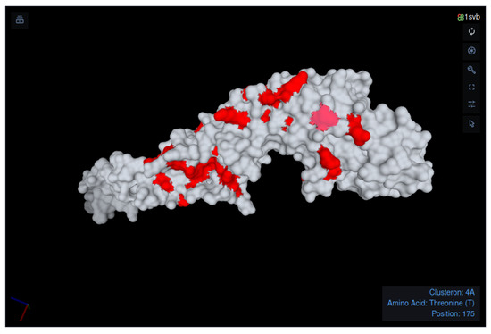 Clusterons are declared based on the E protein amino acid sequence. Thus, each clusteron has its own unique specific amino acid signature, except for the homoplastic clusterons 3C-3C2-3C3, 3A-3A2, 3L-3L2, and 3F-3F2, which have the same signature and phylogenetically different lineages. The signatures were collected from published data [6,20] and further updated in the platform. We expanded the report by adding a new section called “Amino Acid Signature”. This section contains a table and 3D visualization. The table lists signatures of all current clusterons (Table 1), with the signature of the query’s assigned clusteron highlighted in red. Through the signatures, key sites that are responsible for phylogenetic characteristics can be determined. For example, the combination of positions 206/234 may serve as a sub-signature for subtype and lineage identification. The highlighted signature is shown on the surface of the E protein (PDB ID: 1SVB [25]) by PDBe Molstar [26,27,28] (Figure 3), a modern web-based toolkit for visualization and analysis of large-scale molecules. This type of interactive visualization permits examination of structural and functional characteristics of key protein positions.