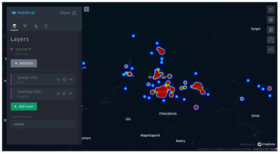 Visualization of viral distribution on the geographical map. The visualization is generated by the web application “Kepler.gl” [29]. The figure shows a heatmap of strains for clusteron 3A across the Ural region.
