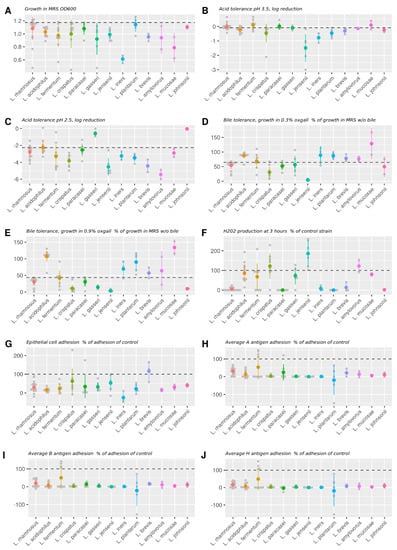 Probiotic characteristics: growth, acid, and bile tolerance, as well as H2O2 production and adhesion characteristics at the species level. (A) MRS growth, OD600; (B) acid tolerance in pH 3.5, log reduction; (C) acid tolerance in pH 2.5, log reduction; (D) bile tolerance in 0.3% oxgall, % growth in MRS without (w/o) bile; (E) bile tolerance in 0.9% oxgall, % growth in MRS w/o bile; (F) H2O2 production expressed as H2O2 production in relation to comparator strain L. jensenii DSM 20557 after 3 h; (G) vaginal epithelial cell adhesion, percentage (%) of adhesion of L. jensenii LX11796; (H) average A-antigen adhesion, % of adhesion of L. crispatus LMG 18204; (I) average B-antigen adhesion, % of adhesion of L. crispatus LMG 18204; and (J) average H-antigen adhesion, % of adhesion of L. crispatus LMG 18204. Mean ± SD values from species with two or more strains in the panel, as well as the individual values of each strain of a particular species, are shown. The acid tolerance data at pH 3.5 in Figure 1B are missing from L. acidophilus LA11897, L. amylovorus LX11898, L. paracasei LC11896, and L. ruminis LX11894. Furthermore, L. paracasei and L. plantarum species are omitted from Figure 1F, as they did not produce H2O2. Two L. iners strains from the panel did not grow and were omitted from the analysis. The dashed line in (A–E) indicates the value obtained from the control strain L. rhamnosus GG. The dashed line in (F) indicates the value obtained from the comparator strain L. jensenii DSM 20557, in Figure 1G the comparator strain L. jensenii LX11796 and in (H–J) the adhesion of comparator strain L. crispatus LMG18199, that is known to adhere well to the A blood group antigen.