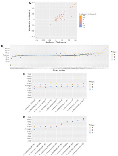Some pathogens and their toxins can bind blood group antigens directly [], such as H. pylori [], Norwalk virus [], norovirus GII.4 genotype [], and rotavirus []. Lactobacilli strains of L. crispatus, L. mucosae, L. plantarum, and L. paracasei express blood group antigen-binding adhesins and therefore may compete in adhesion mechanisms that impede pathogenesis [,,,,]. Moreover, blood group antigens, glycans on ABO antigens, and Lewis antigen shed into the intestinal lumen can be fermented by intestinal bacteria such as bifidobacteria and Bacteroides spp.; thus, these glycans can serve as energy sources for bacteria and affect the composition of the gut microbiota []. Research shows that the composition of intestinal mucosal microbiota is affected by the ABO blood type and the secretor status of the host [,], especially the presence of B antigen [], although contradictory results have also been reported []. However, information on the adhesion properties of probiotics to different blood group antigens could be relevant in the design of personalized probiotics for the market because specific adhesins toward a certain blood group antigen could further increase the colonization potential of probiotics. In our study, strains were differentiated and ranked as having antigen-specific adhesion, non-specific adhesion (similar affinity to all), or equal affinity (highest median adhesion). This categorization could be used to tailor probiotics based on adherence toward a certain blood group antigen or implement a more generic approach that is suitable for most consumers. Among the top 10 strains with the most variability in their adhesion to blood group antigens, 2 were commercial (L. rhamnosus HN001 and L. rhamnosus Lr-32).