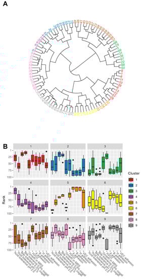 (A) Nine clusters formed from the rank-ordered data of the 98 strains using hierarchical clustering with Ward’s method. The numbers indicating the strains are depicted in Table 1. The quantity of bacteria in different clusters is as follows: cluster 1: 14; cluster 2: 12; cluster 3: 10; cluster 4: 16; cluster 5: 8; cluster 6: 14; cluster 7: 6; cluster 8: 7; and cluster 9: 11. (B) The biological parameters measured from the strains in each cluster represented by box plots. The box shows the interquartile range, the line inside the box indicates the median, whiskers indicate the minimum and the maximum values, and dots represent the outliers.