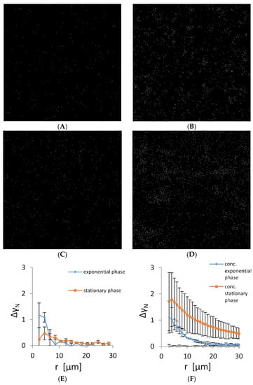 Positions of individual bacteria on microscopy images of size 400 µm × 400 µm grown in CM growth medium. (A) Cells in the early exponential growth phase, (B) early exponentially grown cells that were concentrated 5-fold, (C) cells in the early stationary growth phase, (D) the early stationary cells concentrated five folds. Scale bar corresponds to 20 µm. (E) Pair-wise (autocorrelation) function (Equation (3)) applied to bacterial positions in microscopy images corresponding to an area of 20 times of the areas depicted in panels (A–D). (F) Autocorrelation of 5-fold concentrated bacterial suspension. For comparison, a pair-wise correlation function is given for computer generated random autocorrelation function (grey line).