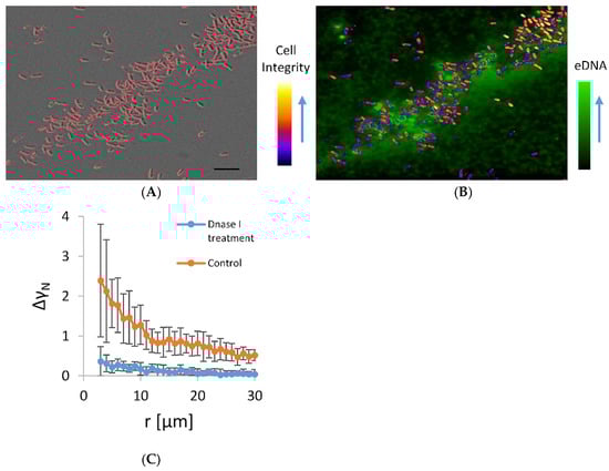 Panel (A) is a DIC micrograph of bacterial aggregate in the early stationary growth phase. Only high-contrast objects that include predominantly cells of high cell integrity likely to represent viable bacteria are outlined. In panel (B), an overlay of fluorescence image of the same bacterial aggregate stained by healthy cell impermeable DNA stain TOTO-1 and an image of colour-coded contrast intensity (Cell integrity) of DIC image is shown. Bright green fluorescence objects are the dying bacterial cells. The cells that were alive are not visible on fluorescence images and are marked by colour-coded DIC contrast intensity. Small fluorescence particles released from the dying cells swarmed around the dying cells. The scale bar corresponds to 10 µm. Panel (C) shows a pair-wise correlation function (Equation (3) applied on microscopy images of concentrated bacterial culture in exponential growth phase treated with DNase I for 30 min at 37 °C; control under the same conditions, but without DNase I.