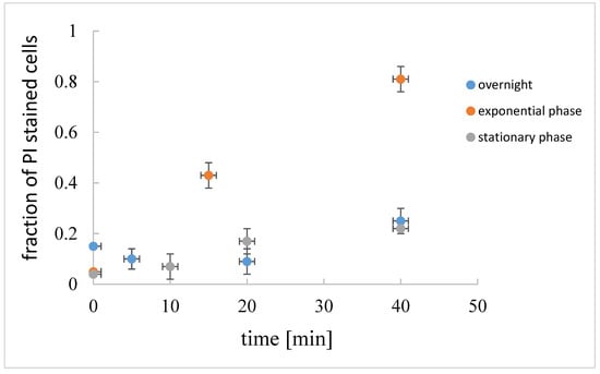 The fraction of the dead cells, i.e., the cells that are stained red by propidium iodide (PI) [] in the exponential, stationary, and overnight culture, is given in Figure 5. In the exponential growth phase, and in the early stationary growth phase, only a small fraction of cells (up to 5%) was dead. The fraction of dead cells increased significantly in the overnight culture. Cells at different physiological states were not equally susceptible to induced cell lysis. If lysis was induced in the exponential growth phase, rapid cell lysis occurred, whereas in the early stationary growth phase or in the overnight culture, induced cell lysis was much slower.