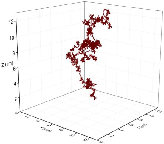 The fraction of lysing cells in the early and in the mid exponential phase was relatively small. To check if the amount of the released eDNA is capable to fill the volume of the observed bacterial aggregates, we modelled the released eDNA by the string-of-beads model [,,]. The size of the DNA was 4 Mbp, and each bead corresponds to B-DNA thickness of 2 nm and the size of 6 bp []. The persistence length of dsDNA was assumed to be 50 nm [,,,,,]. Several runs of the simulation were performed, and a representative snapshot of eDNA is depicted in Figure 6. The average radius of gyration (Rg) for the eDNA was estimated to be approximately 8 μm. The effective volume occupied by eDNA scales as Rg3 and released eDNA molecule can fill the volume of approximately 500 μm3, exceeding significantly the volume of a single bacterial cell (about 1 μm3) facilitating local bacterial aggregation. Therefore, the released eDNA from as little as 5% of dead cells can significantly increase the connectivity between cells in the exponential grown bacterial culture and can act as agglutinin between neighbouring cells, as observed in the aggregates.