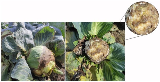 According to Song et al. [], P. carotovorum is ranked among the most common causative agents of cabbage soft rot. Nonetheless, P. aroidearum, P. brasiliense, P. odoriferum, P. polaris, and P. wasabiae species have also been reported to result in cabbage soft rot in different countries [,,,,,]. In Serbia, different Pectobacterium species (i.e., P. atrosepticum, P. brasiliense, P. carotovorum, P. punjabense, P. zantedeschiae, and P. versatile) have been isolated from broccoli, calla lily, carrot, celery, parsley, potato, squash, and watermelon [,,,,,,,,].