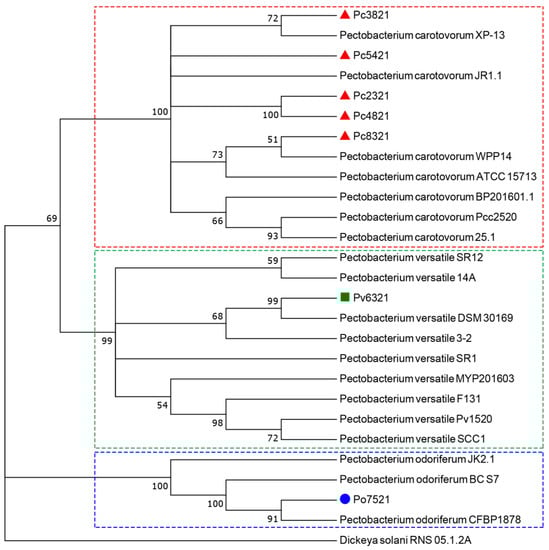 - Portier, P.; Pédron, J.; Taghouti, G.; Fischer-Le Saux, M.; Caullireau, E.; Bertrand, C.; Laurent, A.; Chawki, K.; Oulgazi, S.; Moumni, M.; et al. Elevation of Pectobacterium carotovorum subsp. odoriferum to species level as Pectobacterium odoriferum sp. nov., proposal of Pectobacterium brasiliense sp. nov. and Pectobacterium actinidiae sp. nov., emended description of Pectobacterium carotovorum and description of Pectobacterium versatile sp. nov., isolated from streams and symptoms on diverse plants. Int. J. Syst. Evol. Microbiol. 2019, 69, 3207–3216. [Google Scholar] [CrossRef]