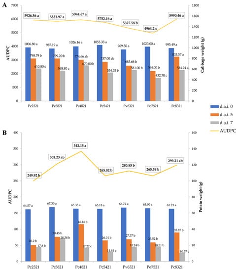 The results of the AUDPC analysis of the tested isolates on cabbage heads and potato tubers are shown in Figure 4A,B, respectively.