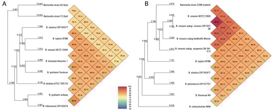 Heat map generated using OrthoANI values based on whole genome sequences, calculated using OAT software and other closely related species. (A) OrthoANI values of Bartonella strain A05 and strain F02. (B) OrthoANI values of Bartonella strain 220B. The numbers in each diamond at the diagonal lines correspond to the OrthoANI values between the species.