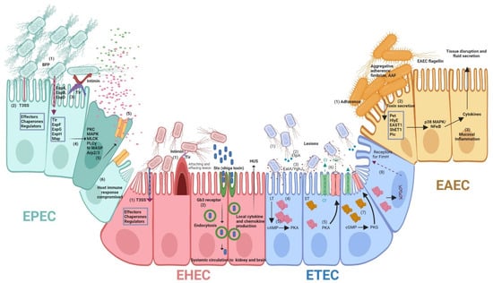 Combined pathogenesis of EPEC, EHEC, ETEC and EAEC. EPEC (Gray) is famous for production of lesions known as “Attaching and effacing (A/E)” lesions that are produced when bacteria intimately attach to intestinal epithelial cells. Bundle-forming pilus (BFP) helps in interbacterial adherence as well as adherence to epithelial cells (1). Pathogens contact the host cell via T3SS and its effectors (2). The intimate attachment of bacteria with the epithelial cells is mediated by the Tir-EspA-EspB-EspD complex into the host membrane and intimin on the bacterial membrane (3). The type III secretion system releases various effector proteins—including Tir, EspF, EspG, EspH and MAP are migrated in the cytoplasm (4) where it interacts with host proteins such as N-WASP and the Arp2/3 complex to cause actin rearrangement and the pedestal formation. Protein kinase C (PKC), phospholipase Cγ, myosin light-chain kinase and mitogen-activated protein (MAP) kinases are triggered. These multiple complex effacements lead to increase intestinal inflammation, intestinal permeability, and loss of absorptive surface area (5,6). EHEC (Red) is also attaching and effacing (A/E) pathogens that efface the microvilli and subvert host cell actin to form pedestals beneath the attachment site, but the mechanism is slightly different from EPEC, Tir is not phosphorylated. EHEC injects effector proteins such as Tir and EspFu into the host cytoplasm through the T3SS (1) and Tir binds to intimin to attach the bacteria to the host cell (1). Tir and EspFu recruit host factors to subvert host cytoskeleton and actin polymerization. In addition, Shiga toxin (Stx; also known as verocytotoxin) is released in response to stress, further contributing to disease. The B subunit of Stx toxin binds to the glycosphingolipid globotriaosylceramide (Gb3), present in lipid rafts on the surface of the target cell and is internalized (endocytosis) (2), and the Shiga toxin is activated through cleavage of the A subunit into two fragments by the protease furin. Stx toxin, if absorbed into the systemic circulation, can cause direct endothelial injury by increasing inflammation, inducing expression of cytokines and chemokines, and even can damage important organs, especially the kidney and the brain. ETEC (Blue) strains adhere to intestinal epithelial cells with the help of one or more peritrichous flagella or fibrillar colonization factors (CFs) (1). EtpA mediates the bridging of flagella with glycan receptors present in mucin (2). Mucinolytic serine protease EatA helps to degrade MUC2, the major mucin secreted by goblet cells, while YghJ is required for efficient access to the surfaces of enterocytes (3) providing bacterial access to the epithelial surface. Coincident with these events, the bacteria deliver pre-formed LT and ST to their respective receptors on the host cell GM1 gangliosides and GC-C, respectively (4), which activates the production of cellular cyclic adenosine monophosphate (cAMP) (5), that initiates intracellular signaling cascades that ultimately lead to chloride efflux from CFTR and inhibition of Na+ uptake through the NHE3 Na+/H+ ion exchanger; resulting in the net export of salt and water into the intestinal lumen and diarrhea (6). Heat-stable toxin (ST) binds to guanylate cyclase C to activate the production of cyclic guanosine monophosphate (cGMP), activating protein kinase G (PKG), which phosphorylates ion channel proteins and the development of diarrhea (7). LT modulates the transcription of multiple genes including those encoding CEACAMs (Carcinoembryonic Cell Adhesion Molecules), which then serve as receptors for FimH of ETEC expressing type 1 fimbriae that promote ETEC adhesion (8). EAEC (yellow) adheres to small and large bowel epithelia in a thick biofilm, releases enterotoxins and cytotoxins, and induces mucosal inflammation. The first step of EAEC infection involves colonization of intestinal mucosa by aggregative adherence fimbriae (AAF) I, II and III which gives characteristic AA pattern as a stacked-brick lattice (1). This is followed by the secretion of different enterotoxins and cytotoxins with different functions, namely, Enteroaggregative heat-stable toxin (EAST-1), Plasmid-encoded toxin (Pet), Protein involved in colonization (Pic), Shigella enterotoxin 1 (ShET-1), and Hemolysin E (HlyE) (2). The role of these virulence factors and their clinical outcome is unclear, but they are associated with increased cytokine production and inflammatory markers resulting in mucosal inflammation (3). The figure was created with BioRender.com (accessed on 22 January 2023).