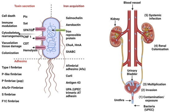 In contrast to enteroinvasive E. coli, Adherent-invasive E. coli (AIEC) is the pathotype with both abilities to adhere to and invade intestinal epithelial cells. AIEC can also survive and replicate within macrophages [3,260]. AIEC is associated with inflammatory bowel disease (IBD), Crohn`s disease (CD) and ulcerative colitis (UC) [261,262,263,264]. AIEC infections are usually characterized by diarrhea, abdominal pain, rectal bleeding, fatigue, and life-threatening complications in severe cases of AIEC and IBD. Reports of bacteriological analysis from Europe and North America showed 30–50% of Invasive E. coli strains are present in the ileal mucosa of Crohn’s disease patients [265,266,267,268]. However, it is still not clear whether AIEC induces intestinal inflammation resulting in IBD or whether they act as an intensifying factor by colonizing the mucosa of patients with pre-existing IBD. AIEC possesses a wide range of virulence factors.