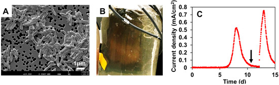 - Yoshida, N.; Goto, Y.; Miyata, Y.; Thakur, V.K. Selective Growth of and Electricity Production by Marine Exoelectrogenic Bacteria in Self-Aggregated Hydrogel of Microbially Reduced Graphene Oxide. C 2016, 2016, 15. [Google Scholar] [CrossRef]