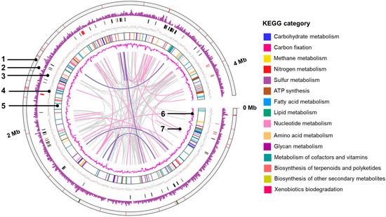 Features of the complete genome of strain NIT-SL11. Circular representation of the genome was generated using Tbtools-Ⅱ (v1.106, https://github.com/CJ-Chen/TBtools-Manual). Rings numbered from the outside to inside are: 1, location of tRNA (red), Transfer messenger RNA (blue), and rRNA (green); 2, gene density; 3, c-type cytochromes (black) and type IV pili (red); 4, G+C skew (red, positive; green, negative); 5, protein-coding sequences colored based on KEGG category; 6, G+C content; and 7, links showing repetitive sequence ≥95% identity (pink, >500 bp; purple, >2 kbp). KEGG, Kyoto Encyclopedia of Genes and Genomes.