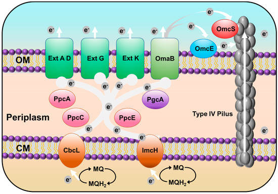 - Otero, F.J.; Chan, C.H.; Bond, D.R. Identification of Different Putative Outer Membrane Electron Conduits Necessary for Fe(III) Citrate, Fe(III) Oxide, Mn(IV) Oxide, or Electrode Reduction by Geobacter Sulfurreducens. J. Bacteriol. 2018, 200, 1–20. [Google Scholar] [CrossRef]