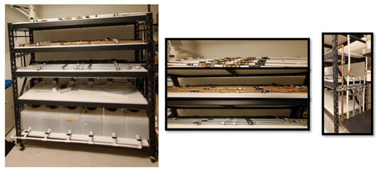 Model drinking water distribution systems—from left to right, front, top and side views. (Front view; tank reservoirs (1st tier, from bottom), pumps (2nd tier), galvanized steel (3rd tier), copper (4th tier), PEX pipes (5th tier)).