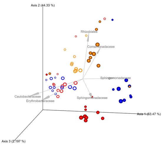 Microbiome Analysis was performed using QIIME2 (2022.08 version). Briefly, the paired-end sequences were imported and demultiplexed into QIIME 2 artifact [16]. The paired-end demultiplexed sequence was then denoised, dereplicated, and filtered out from chimers using the DADA2 pipeline with standard truncation and trimming of low-quality ends [17]. For the 66 samples, a total of 1513 features with a total frequency of 1,566,315 were obtained. Samples with less than 18,760 reads, features that represent Mitochondria and chloroplast, and features with very low abundance (less than 10 frequencies across all samples) were removed using QIIME2. This resulted in an OTU table containing 61 samples with 555 features and a total frequency of 1,466,314. The OTUs were then classified by taxon using classify-sklearn trained with the GreenGenes ribosomal RNA gene database (13_8 99% OTUs) [18]. After the classification, the detection frequency of the selected OPs was calculated at the family taxon level (Table 1). For bacteria with most abundant class, the mean relative abundance was calculated for each system (Figure 3).