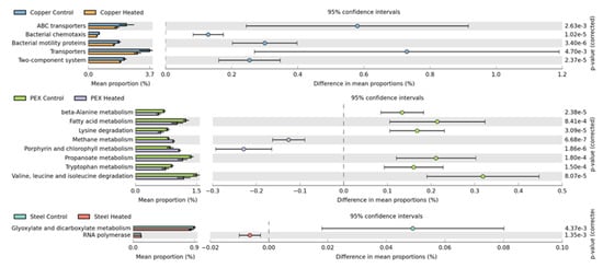 PICRUSt2 was used to predict the metagenomic functional content of each model DWDS for determining the differentially abundant metabolic pathways between the 32 °C and 22 °C for each pipe material system. PICRUSt2 predicted a total of 328 KEGG pathways in all six model DWDSs. The predicted metabolic pathways that were differentially abundant between 32 °C and 22 °C systems with a statistical significance (p < 0.05) are 49, 129 and 35 for copper, PEX and galvanized steel systems, respectively. Only metabolic pathways that have a mean proportion difference of 0.1 or higher and Welch’s test confidence interval (CI) of 0.95 or higher are further investigated (Figure 8).