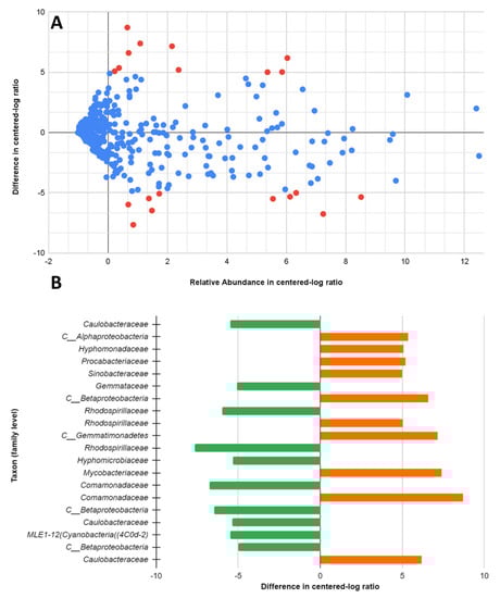 ALDEx2 differential abundance analysis between the 32 °C and 22 °C systems.: (A) Bland–Altman or MA plot between relative abundance and difference. (Significantly different taxa are plotted in red); (B) significantly differentially abundant taxa classified at the family level. (32 °C: green, 22 °C: orange).