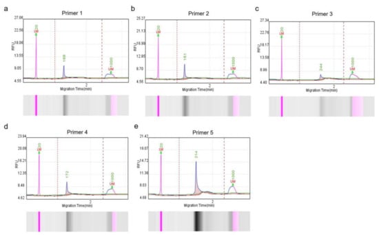 Capillary electrophoresis of RPA-amplified products, corresponding to five primer pairs (a–e). Products were analyzed using the Q-sep 100 automatic nucleic acid analysis system. The abscissa axis represents DNA fragment migration time, and the ordinate axis represents fluorescence signal intensity. The sample concentration is calculated by comparing the peak plot area of the standard concentration with the peak plot area of the test sample. Five primer pairs were used for RPA amplification.