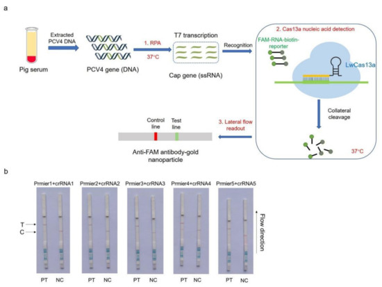 We developed a highly sensitive and specific PCV4 Cap gene-detection method. When compared with conventional methods, our RPA-Cas13a-LFD assay was simple, fast, accurate, and suitable for on-site testing. Therefore, our assay has potential applications for detecting and controlling PCV4 in the field. All authors have read and agreed to the published version of the manuscript.