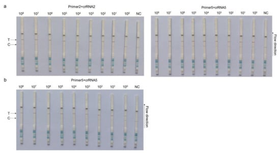 Based on different primer pairs and probe combinations, the sensitivity of CRISPR–Cas13a-LFD was evaluated with a 10-fold serial diluted template at a concentration from 1 × 108 copies/µL to 1 × 100 copies/µL of the template. The combination of primer5 +crRNA5 had a higher sensitivity, for which the detection limit could reach 1 × 100 copies/µL; primer2 + crRNA2 composition could reach the detection limit of 1 × 101 copies/µL (Figure 3a). The primer5 + crRNA5 combination was selected for further clinical detection with 1 × 100 copies/µL, which was the ultimate limit of detection for this method (Figure 3b).
