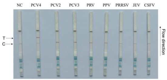 To test CRISPR–Cas13a-LFD specificity, seven swine pathogens, including PCV2, PCV3, PRV, PPV, PRRSV, JEV, and CSFV, were used. The primer5 + crRNA5 combination showed that positive LFD signals were identified only for PCV4, while negative signals were observed for all the other swine pathogens (Figure 4). Therefore, our assay demonstrated high PCV4 specificity.