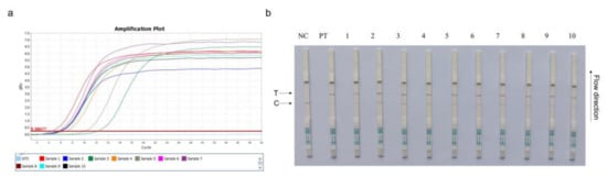 Spiked-in serum inhibitor interference in RT-PCR (a) and CRISPR–Cas13a-LFD (b) assays. NC = negative control; PT = pMD-19T-PCV4 plasmids (359.2 copies/μL), 1: serum (S): PT = 1:0.001, 2: S:PT = 1:0.01, 3: S:PT = 1:0.02, 4: S:PT = 1:0.1, 5: S:PT = 1:0.5, 6: S:PT = 1:10, 7: S:PT = 1:20, 8: S:PT = 1:50, 9: S:PT = 1:100, and 10: S:PT = 1:200. T = test line; C = control line.