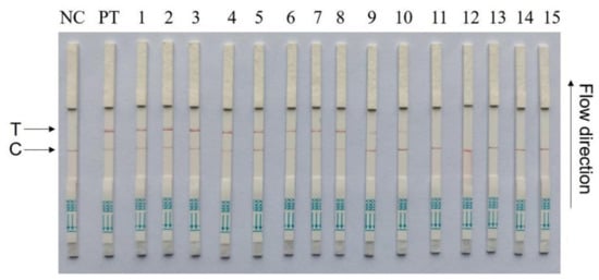 Clinical sample detection by CRISPR–Cas13a-LFD assays. Fifteen samples were used for testing. NC = negative control; PT = pMD-19T-PCV4 plasmids; T = test line; C = control line.