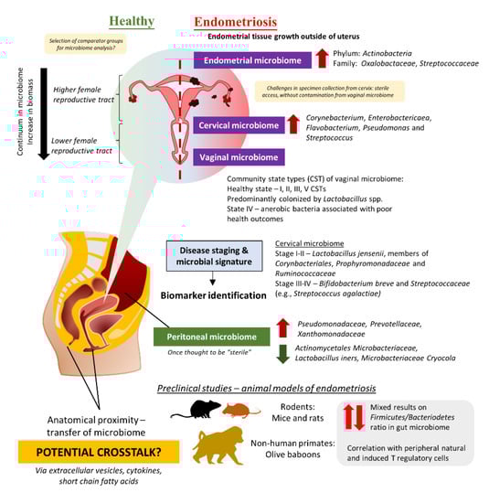 - Jiang, I.; Yong, P.J.; Allaire, C.; Bedaiwy, M.A. Intricate Connections between the Microbiota and Endometriosis. Int. J. Mol. Sci. 2021, 22, 5644. [Google Scholar] [CrossRef] [PubMed]