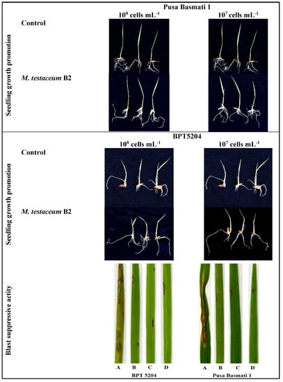 Growth stimulant and Blast disease suppressive activity of Microbacterium testaceum B2 on rice (A) Pusa Basmati 1. (B) BPT5204.