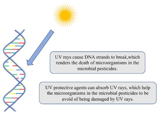 UV radiation causes passivation, degradation, or damage to microbial pesticides(Figure 2) [70]. UV rays can inhibit the growth of microorganisms, and even cause them to die in severe cases. UV protection agents used for the production of microbial pesticides are mainly divided into UV ray absorbers and anti-oxidative UV protection agents. UV ray absorbers such as locust toxin, optical brighteners, lignosulfonates, and milk can absorb the UV part of sunlight and fluorescent light sources without changing itself [71]. Anti-oxidative UV protection agents such as Rubus oil, hemp seed oil, kojic acid, hydroxykynurenic acid, flavonoids, and lecithin have strong antioxidant effects to help microbial pesticides to avoid being easily oxidized and degraded into other substances that are ineffective against harmful organisms under the irradiation of UV rays. Recently, the development of nanomaterials also provides new ideas for novel UV protective agents [72]. Although UV protective agents such as melanin, berberine, fluorescent whitening agents, and Congo red have significant photoprotective effects on Bt, they are cytotoxic to Bt, and may have a certain impact on the environment [73]. Herein, environmental friendliness should also be considered when UV protective agents are developed.