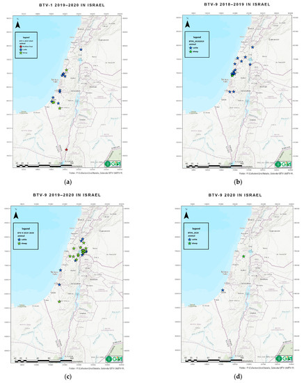 Distribution of BTV-1 and BTV-9 by seasons during 2018–2020. Stars show geographic settlements and type of animals where BTV was identified. (a) BTV-1 distribution during the end of 2019–beginning of 2020. Location of BTV-1-infected goats are not signed because BTV-1 was also identified in sheep in the same farm. (b) BTV-9 distribution during the end of 2018–beginning of 2019. (c) BTV-9 distribution during the end of 2019–beginning of 2020. (d) BTV-9 distribution during the end of 2020.