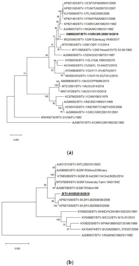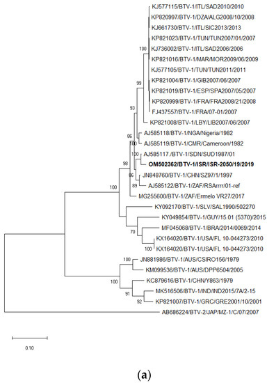 Segment 5. The Israeli BTV-9 clustered with untyped BTV ISR-2237/18, which was detected in the brain tissue of a dead calf, manifested neural signs before death and was submitted to KVI for pathogen identification, where Shuni virus was identified [34] (Figure S1d).