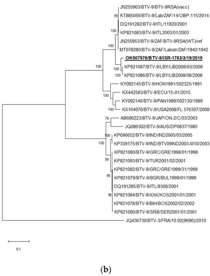 Segment 6. Similar to the BLAST analysis, phylogenetic analysis revealed that Israeli BTV-1 clustered with the South African BTV-1 VR49 strain isolated in 2017 (Figure 3a). Phylogenetic analysis showed the close relationship of Israeli BTV-9 and Libyan BTV-9 strains (LYB2008/03 and LYB2008/08), similar to the BLAST analysis (Figure 3b).