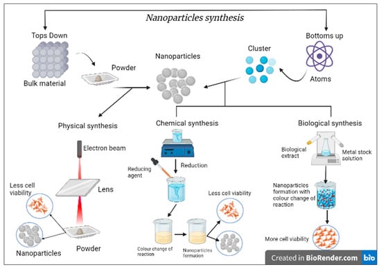 Top-down and bottom-up methods are primarily utilized to synthesize NPs []. In top-down approaches, it involves breaking bulk material into nanosized or nanomaterials, along with significant structures and their original characteristics, without changing the atomic or sub-atomic level []. The bottoms-up method involves the chemical or physical forces to build the nanoscale structures by assembling or self-assembling processes []. However, the bottom-up approach is further classified into physical, chemical, and biological subgroups. Figure 1 explains in detail the diagrammatic representation of the synthesis process.