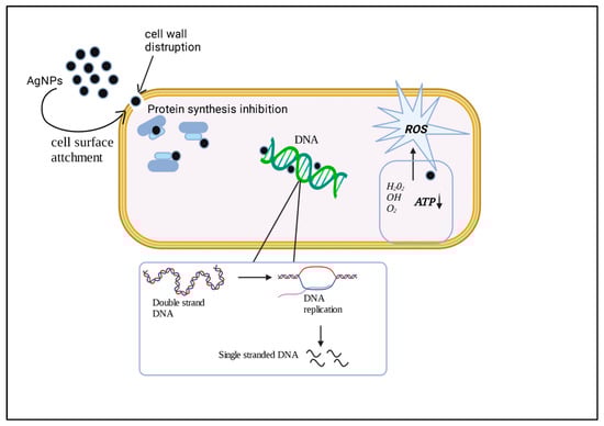 The exact reason for the antimicrobial effect of AgNPs on bacteria has yet to be cleared. In Figure 2, we explain a possible mechanism of action of AgNP by which it paves antimicrobial activity. Silver ions are continuously released from silver nanoparticles, which may consider a mechanism for killing microbes. Silver ions can easily adhere to the cell wall and cytoplasmic membrane as they are more closely related to sulfur proteins and also due to electrostatic attraction [,,,,,,]. At the same time, the bacterial envelope is disrupted because when silver ions attach to the cell wall or cytoplasmic membrane, it enhances the permeability of the cell and ultimately leads to cell disruption. When free silver ions are uptake by cells, they deactivate respiratory enzymes, generating reactive oxygen species interrupting adenosine triphosphate production. ROS is the principal species that provokes the activity of DNA modification and cell membrane disruption. In DNA, sulfur and phosphate are essential components. Still, the interaction of AgNPs with sulfur and phosphorus in DNA can cause difficulties in DNA replication and cell reproduction or even result in the termination of bacteria. Sometimes, the ribosome’s denaturation in the cytoplasm occurs as the silver ions can inhibit protein synthesis [,].